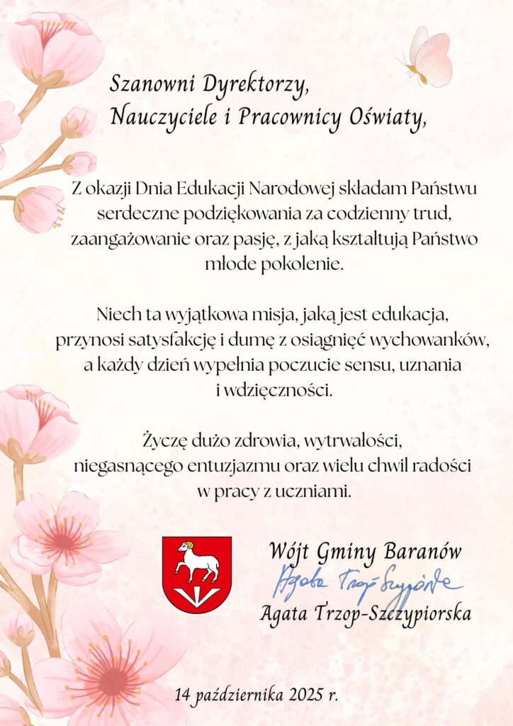 Życzenia Wójta Gminy Baranów dla Dyrektorów, Nauczycieli i Pracowników Oświaty